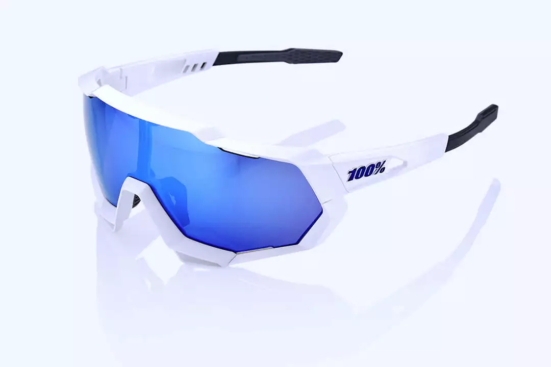 The 100% Speedtrap’s expansive frame geometry increases peripheral vision and protection whilst offering the best possible peripheral vision of any full frame glasses. They deliver this enhanced vision and clarity by following the natural contours of your eye with a custom, optically correct, decentred 6-base cylindrical shield lens.