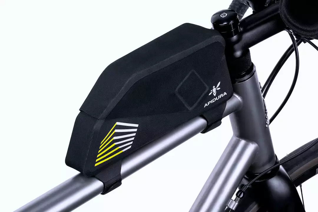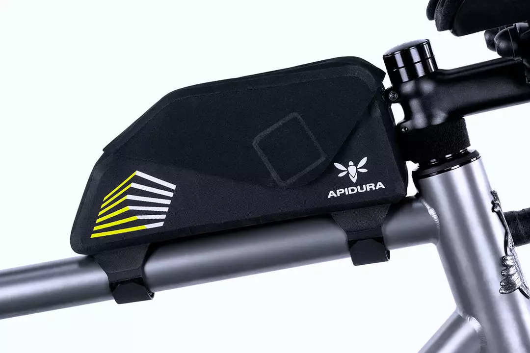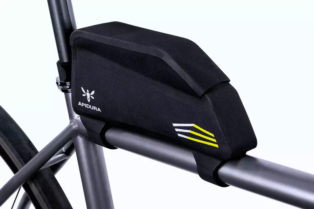 Constructed from an ultralight laminate developed for Apidura, this bag fastens securely to the top tube, stem and seat post and works alongside a wide range of frame bags. An adjustable internal divider and the fully waterproof two-way zipper make it easy to arrange and access belongings, while keeping everything dry.
