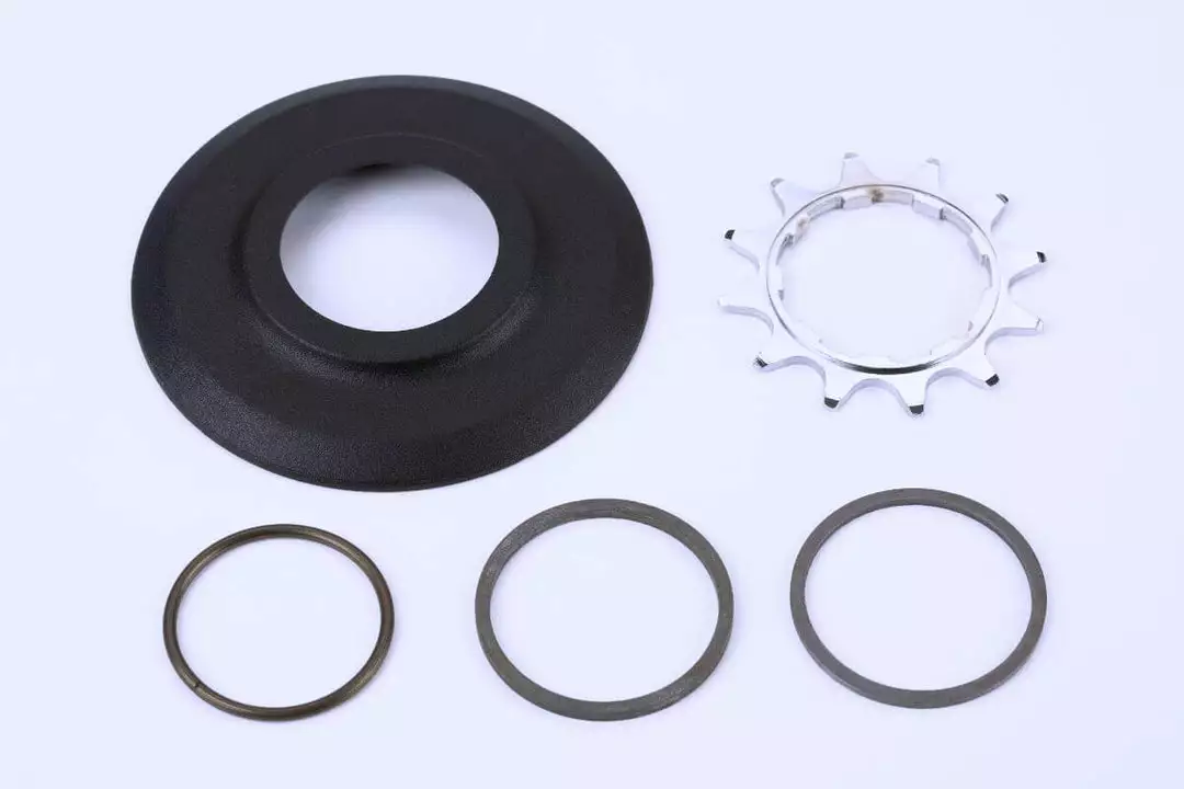 Genuine Brompton sprocket set including chain guide disc for 1-speed hubs (9-spline).