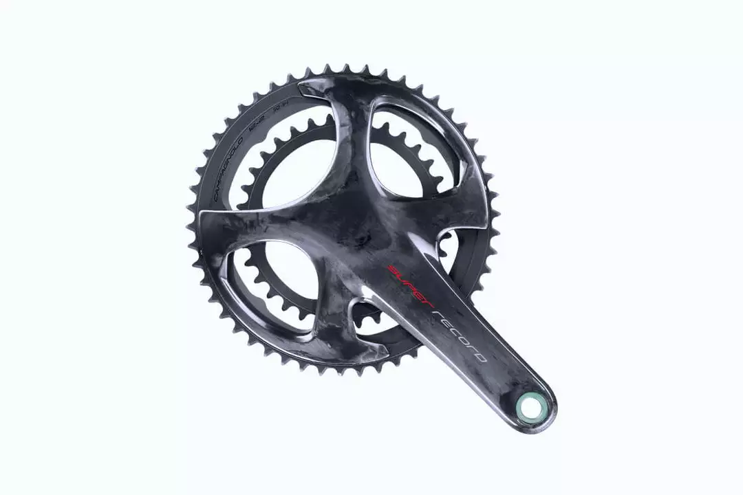 The use of ceramic Cult bearings leads to obtaining the smooth ride that the Campagnolo brand is known for. The innovative design of the outer chainring ensures faster, quieter derailing owing to the contoured pin. The symmetrical design of the inner chainring teeth allows improved stability with chain crossovers. The double wheel sizing standards (112 and 145 millimetres) combined with the eight fixing screws, optimises weight and stiffness through the increased use of carbon fibre.