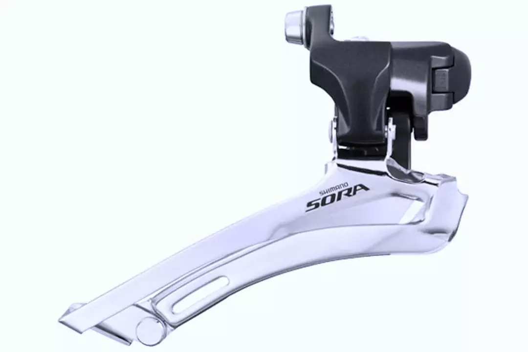 9-speed compatible Sora double front derailleur delivers great value to sport-level road riders. Wide pivot link increases rigidity while reducing flex for improved shifting response. Aluminium links and band to save weight and increase rigidity.