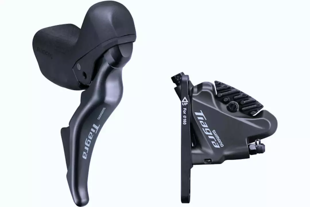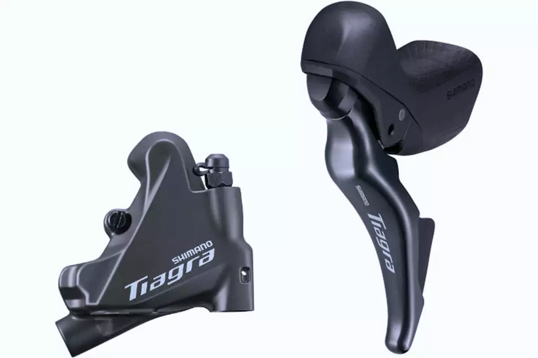 Slim ergonomically designed short reach Tiagra Dual Control Levers for hydraulic disc brakes offer powerful braking and effortless 10-speed shifting.