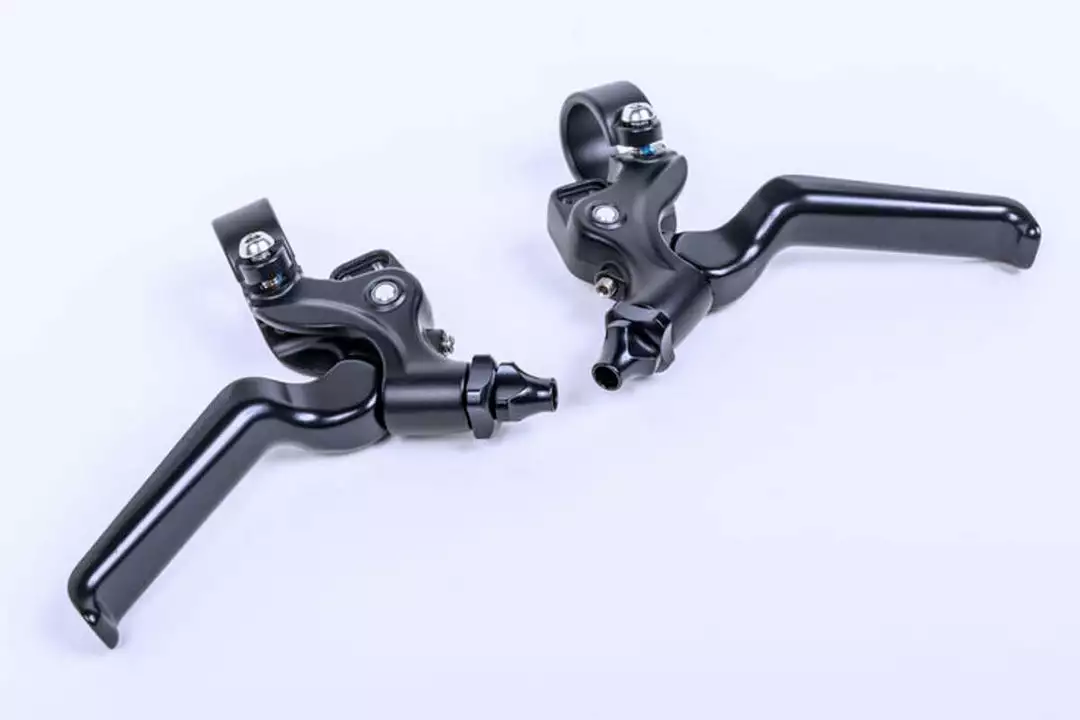 A pair of new style aluminium brake levers as introduced in 2017, with mounting holes for the new integrated bell and gear shifters.
