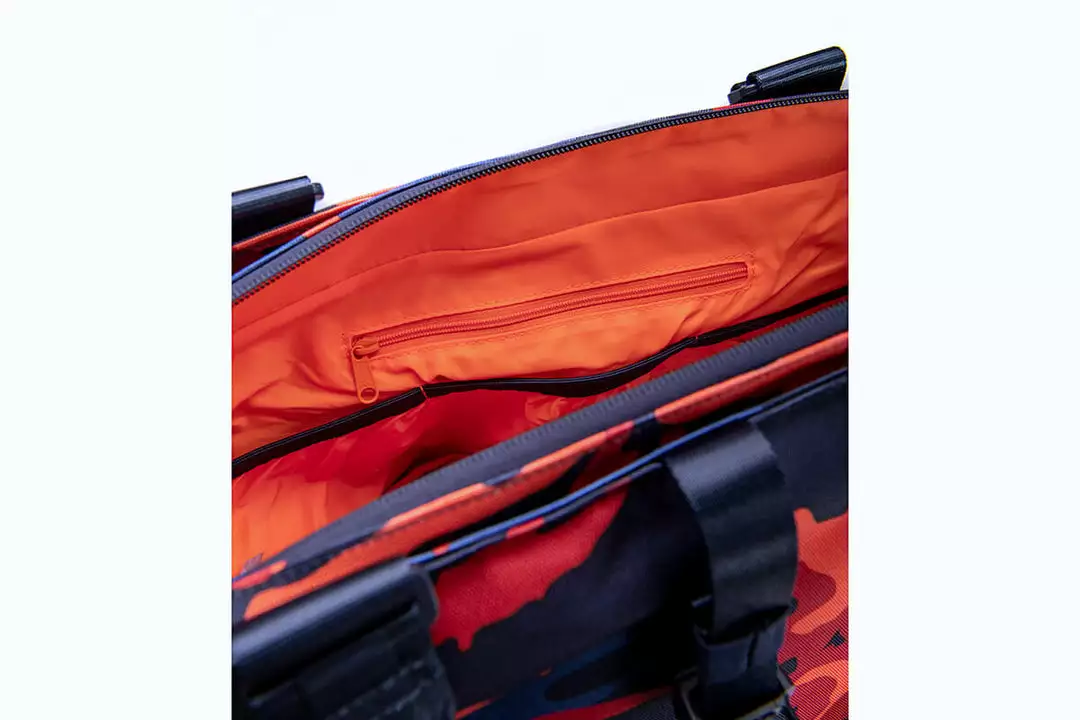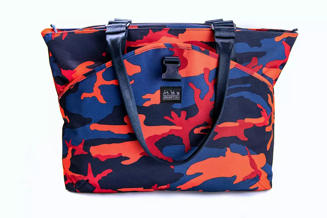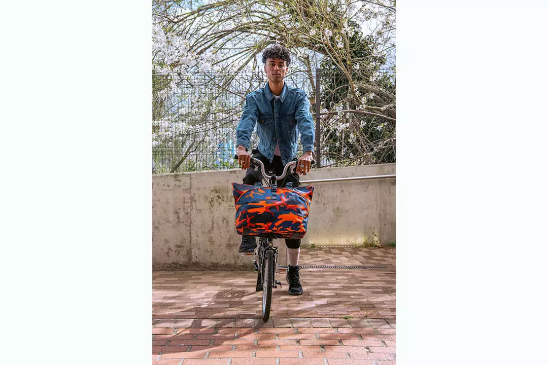 Inspired by the joy of riding through cities and the collective of individuals that make each one unique, the standout DISRUPT print plays on a design originally created to blend in. Made to stand up to daily use on and off your Brompton bike, the DISRUPT Borough Tote bag is constructed using sustainable 900D Polyester fabric from REPREVE®. A sustainable woven material made from certified post-consumer waste. There are more than twenty plastic bottles recycled into every bag. Inside is lined with a pop-colour orange nylon fabric. Created with all the organisational features you need to make packing and finding your belongings easy, the tote bag is fitted with multiple pockets inside and out—functional, flexible, and uniquely Brompton.
