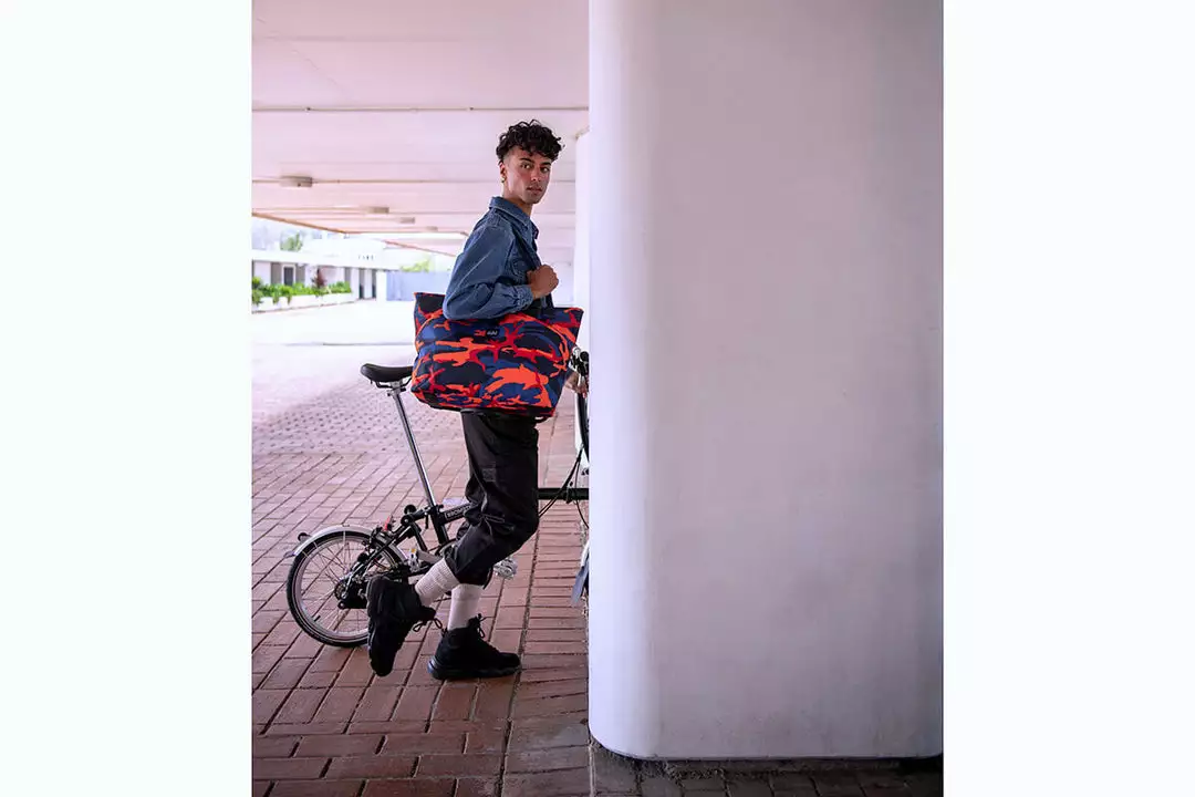 The large capacity zipped Borough Tote with a special edition DISRUPT print. Packs in 20-litres of space for big cargo days and overnight stays. Designed and tested to fit on the front of your Brompton when you’re riding and work as a regular tote when you’re not.