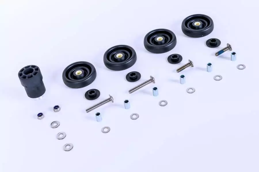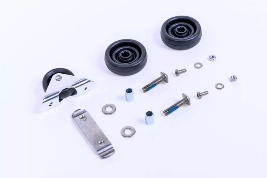 Genuine Brompton roller wheel set with all fittings included. Available for version E/L and R bikes.