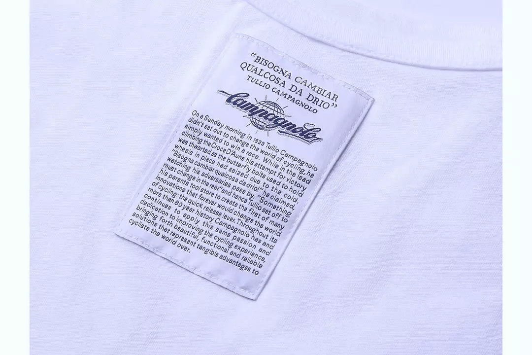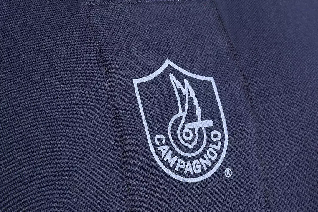 Designed and used by Campagnolo since the fifties, it was intended to represent a very important aspect of the company, its visionary approach to both the market with the world in the background and to innovation with the clear writing “brevetti”. The Brevetti Campagnolo T-shirt is made even more striking by the logos on the sleeve and back, the Campagnolo tag on the front stitching and the exclusive inside label that tells the story of how Tullio Campagnolo came up with the first quick-release.