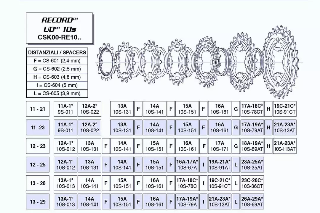 Replacement cassette spacer for use with Record 10-speed cassettes. The spacer is available in three sizes depending on the position in the cassette. Campagnolo tech docs provides information on which spacer is required and where.