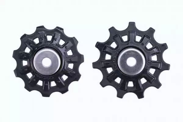 A set of genuine Campagnolo Record 11-speed jockey wheels, compatible with Record, Chorus, Potenza, and Centaur.