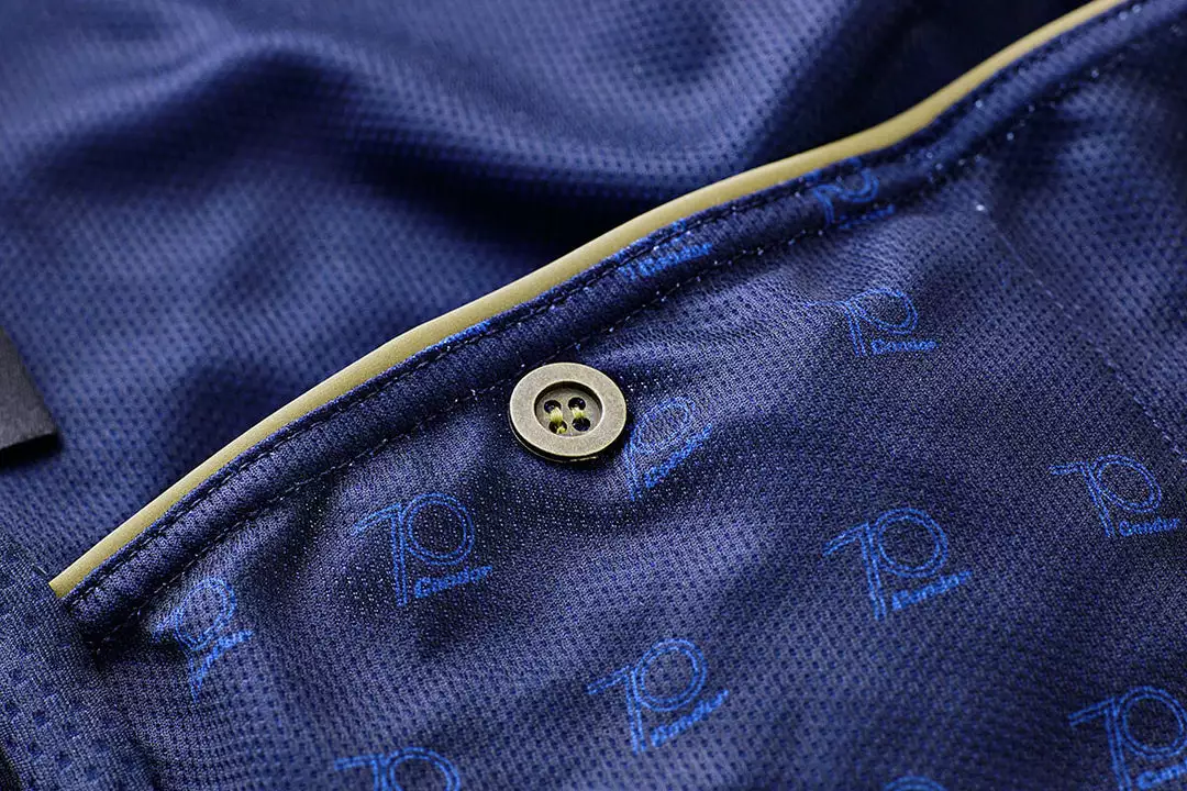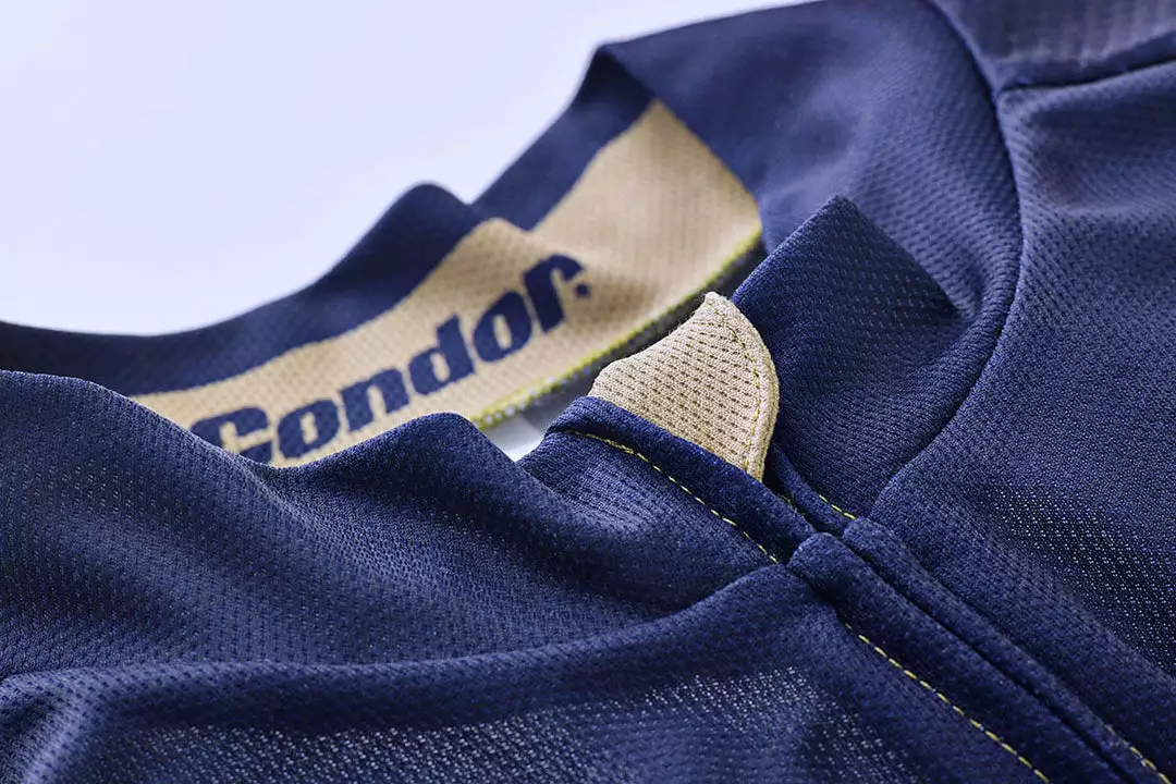 The sleeves are finished with a gold reflective trim and reflective 70th logo on the chest. On the back, you’ll find three pockets and a waterproof zippered pocket. A gold button is stitched on the left pocket – a nod to the pockets of woollen race jerseys of Condor’s early years.