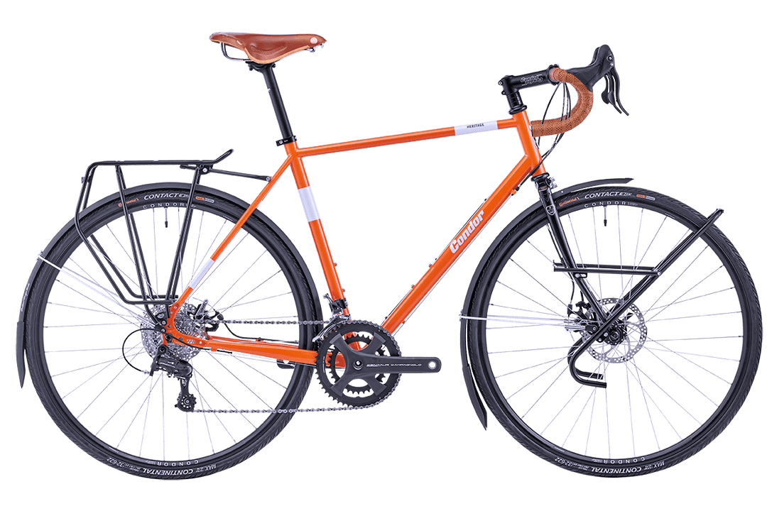 A modern bike with traditional accents, the Heritage Disc is a robust mile-eater, featuring a classic Tange disc ready steel fork, perfect for carrying heavy loads. Using a new lighter front triangle made with custom Columbus Spirit tubing, the same as our magazine test winning Fratello. The Heritage boasts light and fast handling and smooth ride. The internal mounted disc ensures pannier bags can be fitted and fully loaded without affecting the braking performance. Tackle round-the-world adventures or country-to-country sightseeing. The Heritage is designed for full-on, months-on-the-road touring without a hiccup.