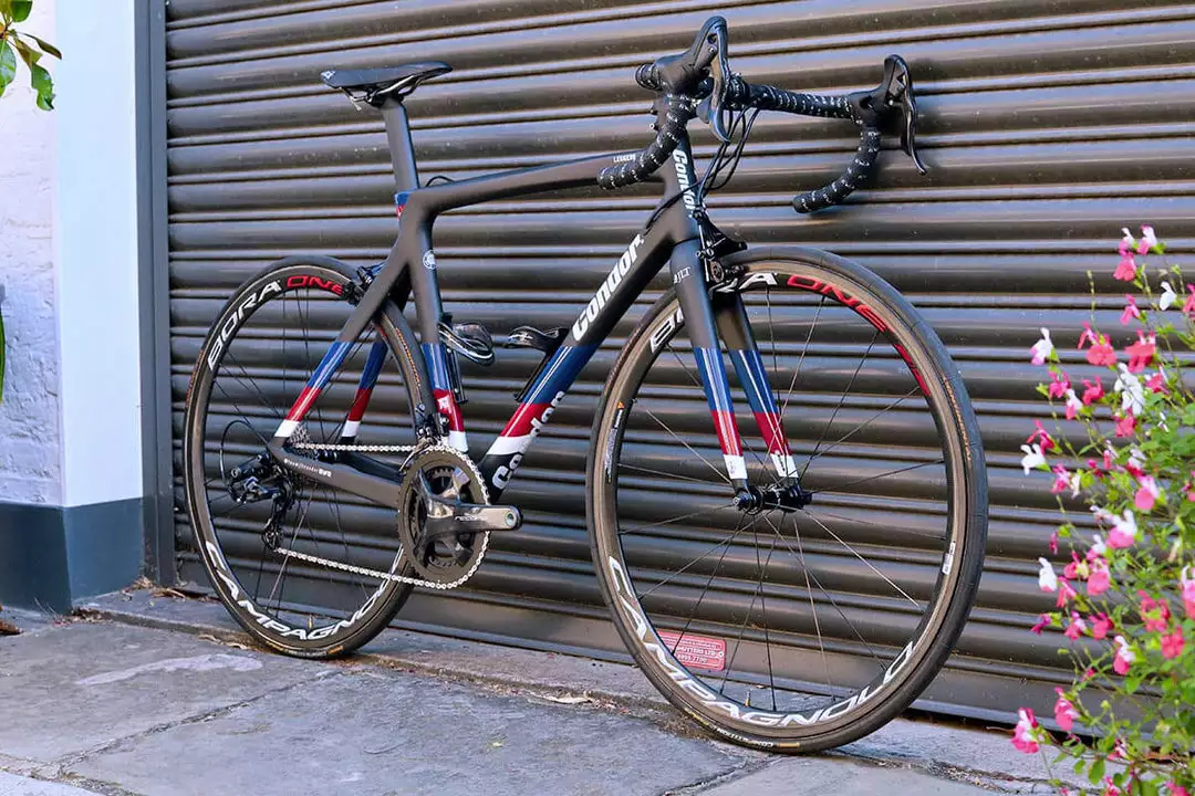 The bike is completed with Campagnolo Bora carbon wheelset and Fizik’s lightweight components.