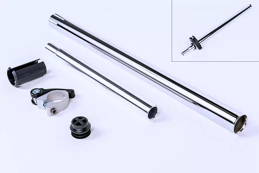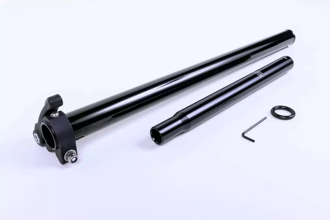 The Telescopic Seat Pillar is designed for taller riders wishing to minimise how far the seat pillar protrudes from the folded Brompton. The telescopic seat pillar gives up to 175mm more elevation yet, when lowered, the saddle projects only 30mm from the folded package. This is the latest ‘Snap-Fit’ version.