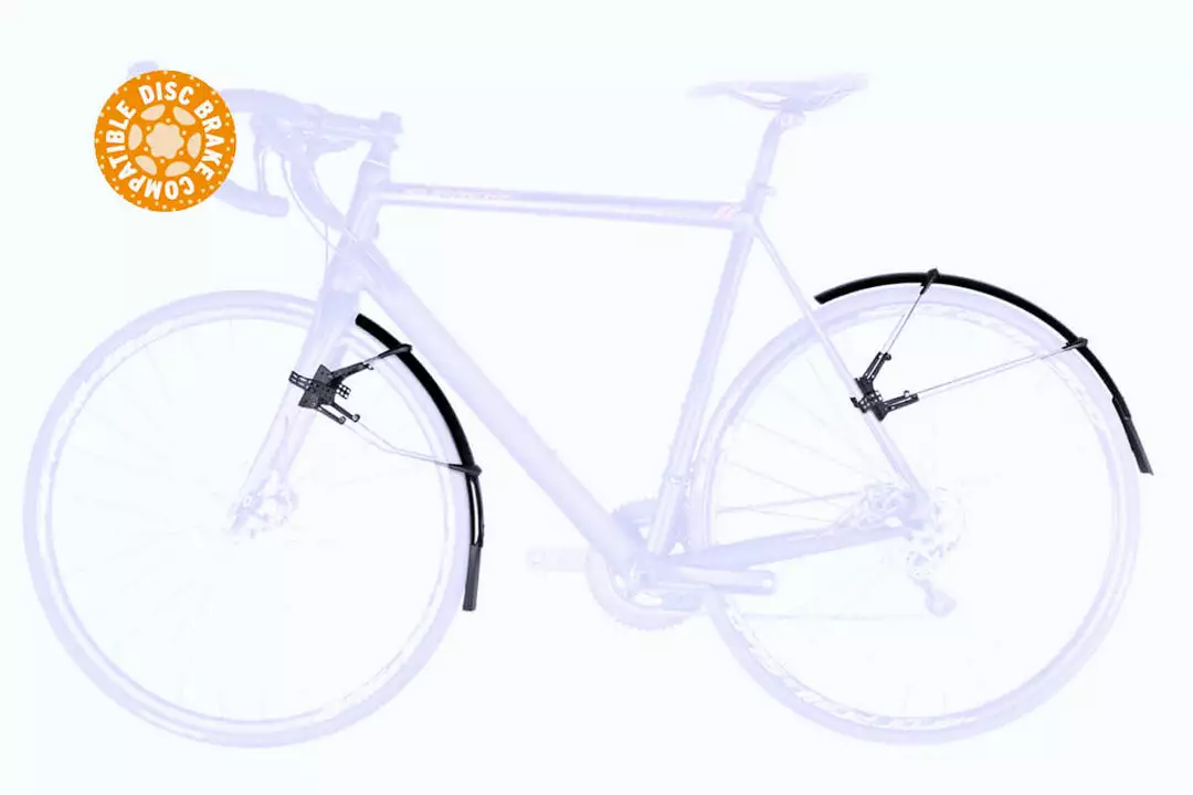 The ulimate clip-on mudguard set for road bikes for tyre width up to 25mm. Its smart, double hinged quick release fitting system also fits aero forks and is also compatible with disc brakes, direct mount brakes and thru axles. Mudguards can be perfectly adapted to the radius of the wheel by adjusting the length of the stays. Its superlight extra long mud flaps give additional spray protection. In addition to using the quick release rubber straps it can also be fixed in place with zip ties. Paintwork protection film for the frame is also included. * Disc brake compatible: Please be mindful of the brake wire.