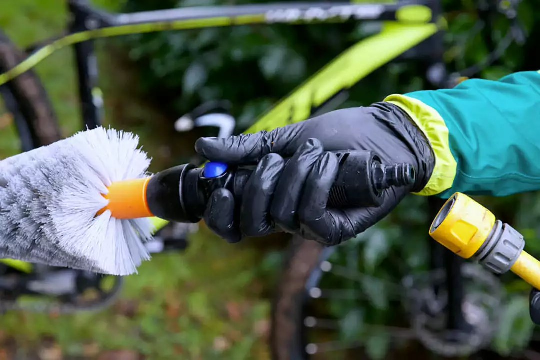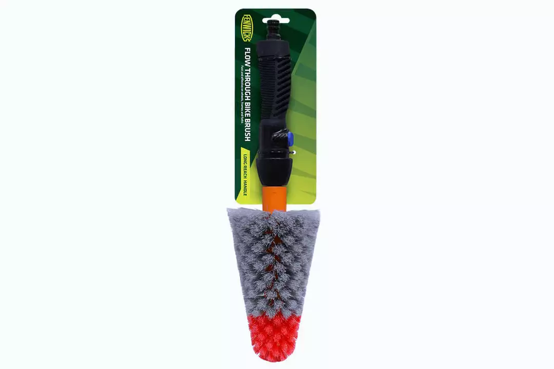 Clip into your hose for a constant flow of water whilst your clean and agitate the grime from your frame.
