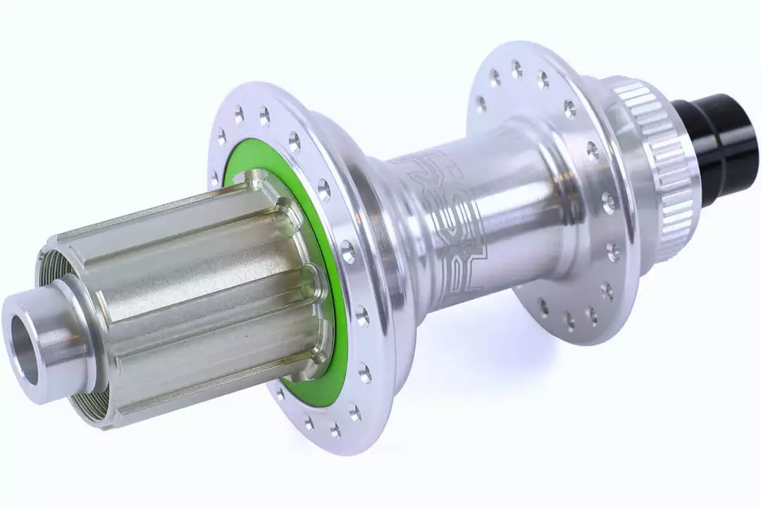 The hub shell is CNC machined in Barnoldswick, England from a single forged billet of 2014-T6 aluminium and uses a 7075 aluminium cassette body. Both these are now machined to allow fitting of the new generation of 11 speed cassettes from Shimano, but still allow for use of 9 and 10 speed Shimano and Sram cassettes by means of a removable spacer.