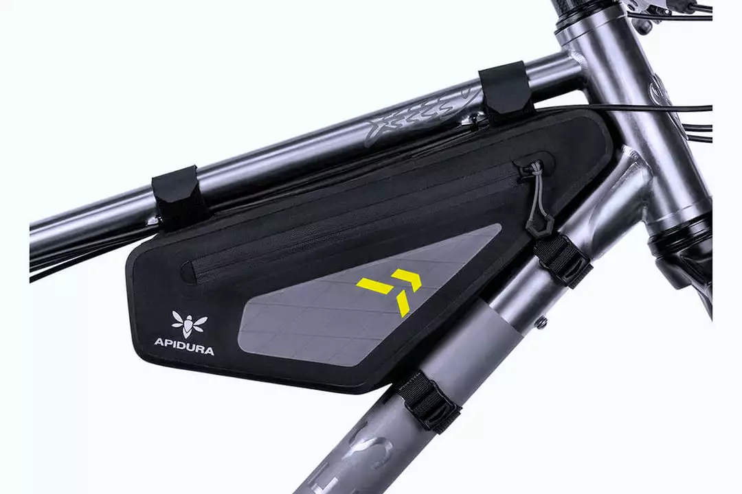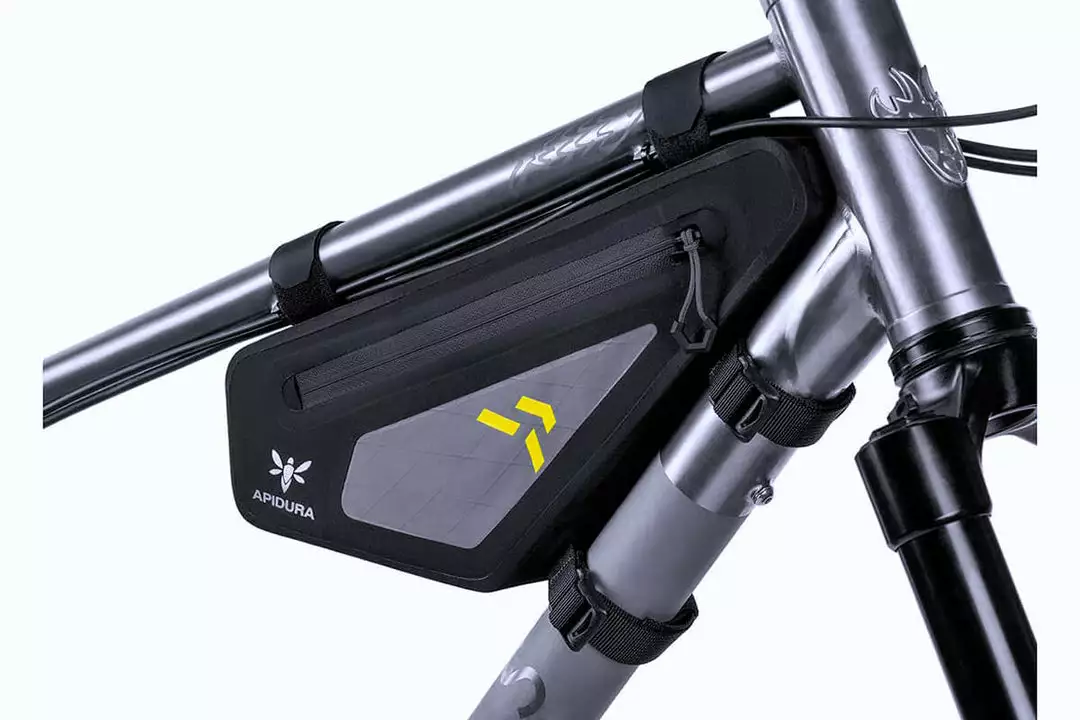 Inside, the frame bag features lash tabs for securing contents and reducing rattle. We’ve also installed a battery lead and hose port for charging electronic devices or drinking on the go. A reinforced structure ensures a stable fit, no matter what shape the frame is.