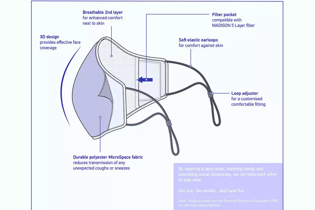 Made from a knitted poly spandex blend which wicks away moisture, helping you stay comfortable all day long. MicroSpace outwards facing fabric helps reduce transmission of unexpected coughs or sneezes.