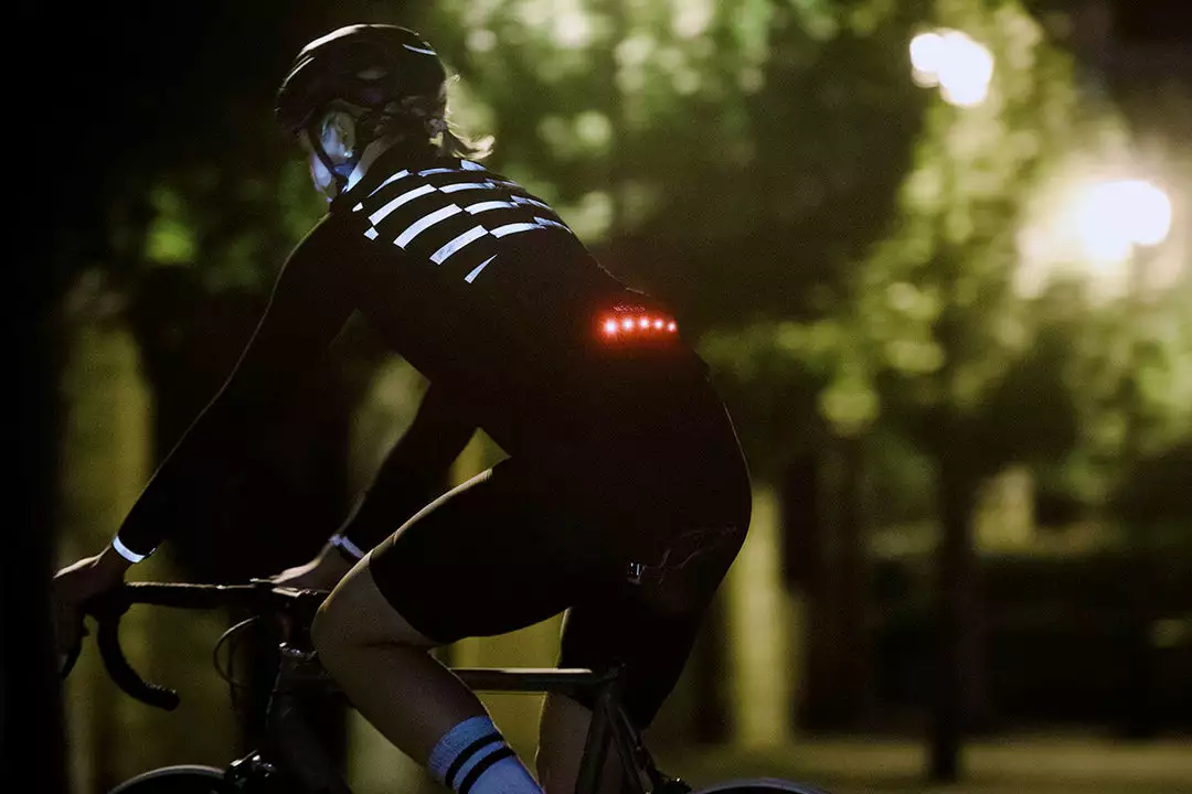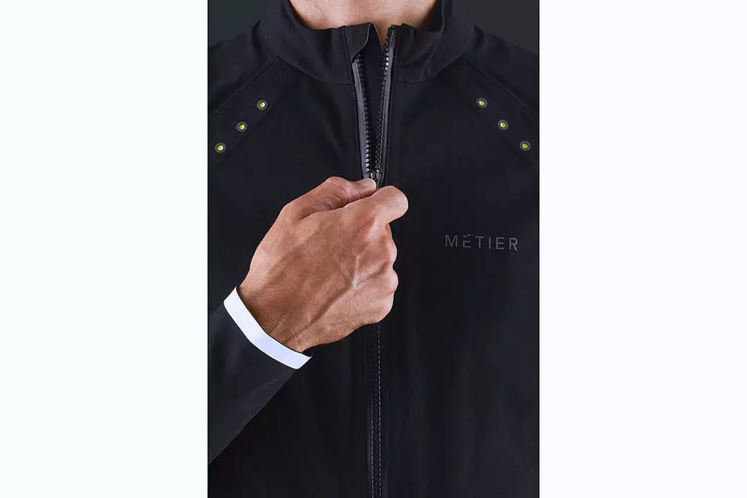 Metier’s Beacon jacket is the world’s first performance cycling jacket with integrated wearable LED technology. The jacket features two front lights, which emit 160 lumen light and a set of rear LED lights set at the base of the jacket emitting 22 lumen red rear light.