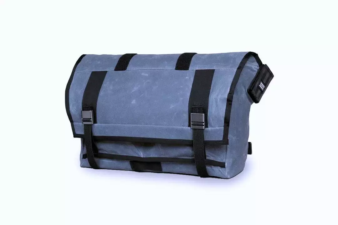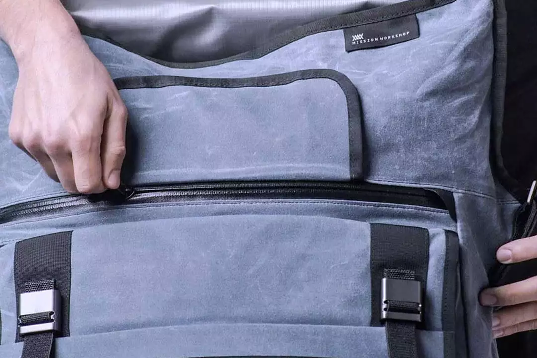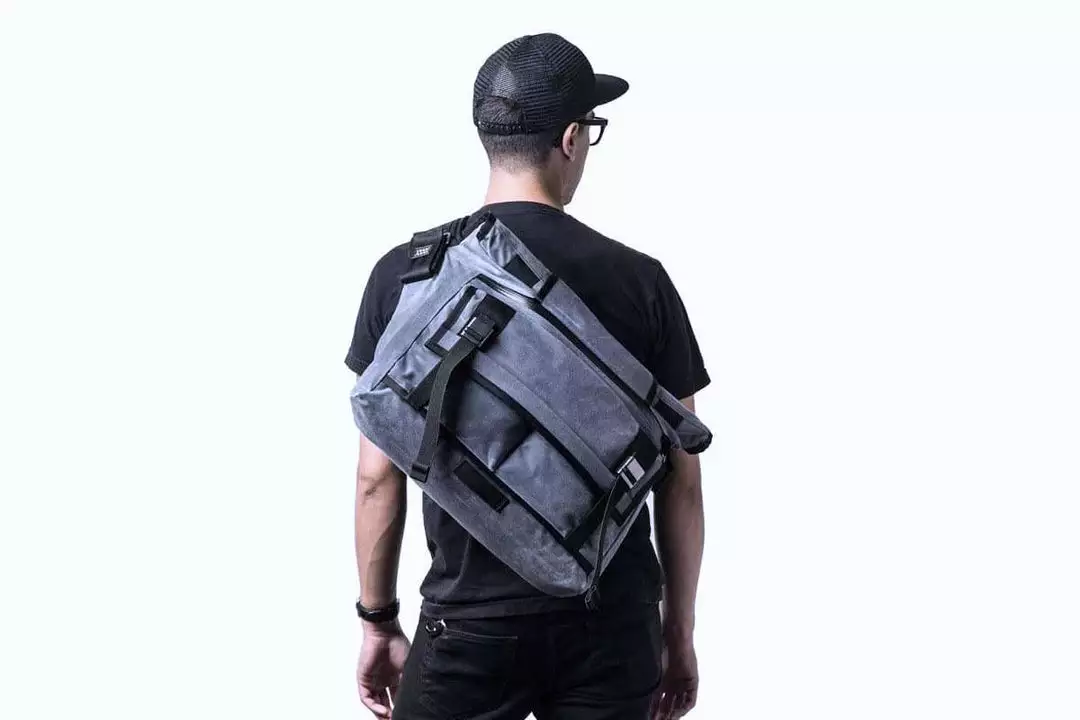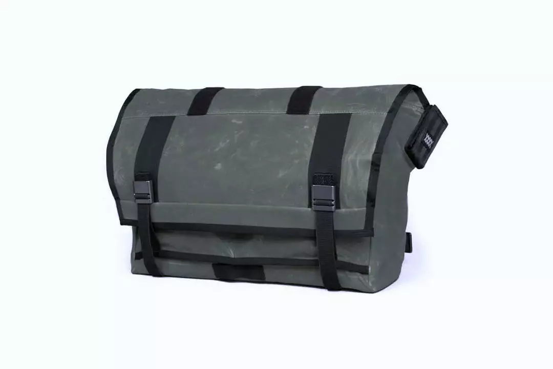 Messenger bag features include: quick-access outboard pockets, internal zippered pockets, custom aluminum strap hardware, and detachable cross-chest stabilizer. Large exterior facing zippered pocket fits up to 15” laptop computers. The weatherproof roll top main compartment can be used in either the “roll top” mode, or in the traditional “flap down” configuration.