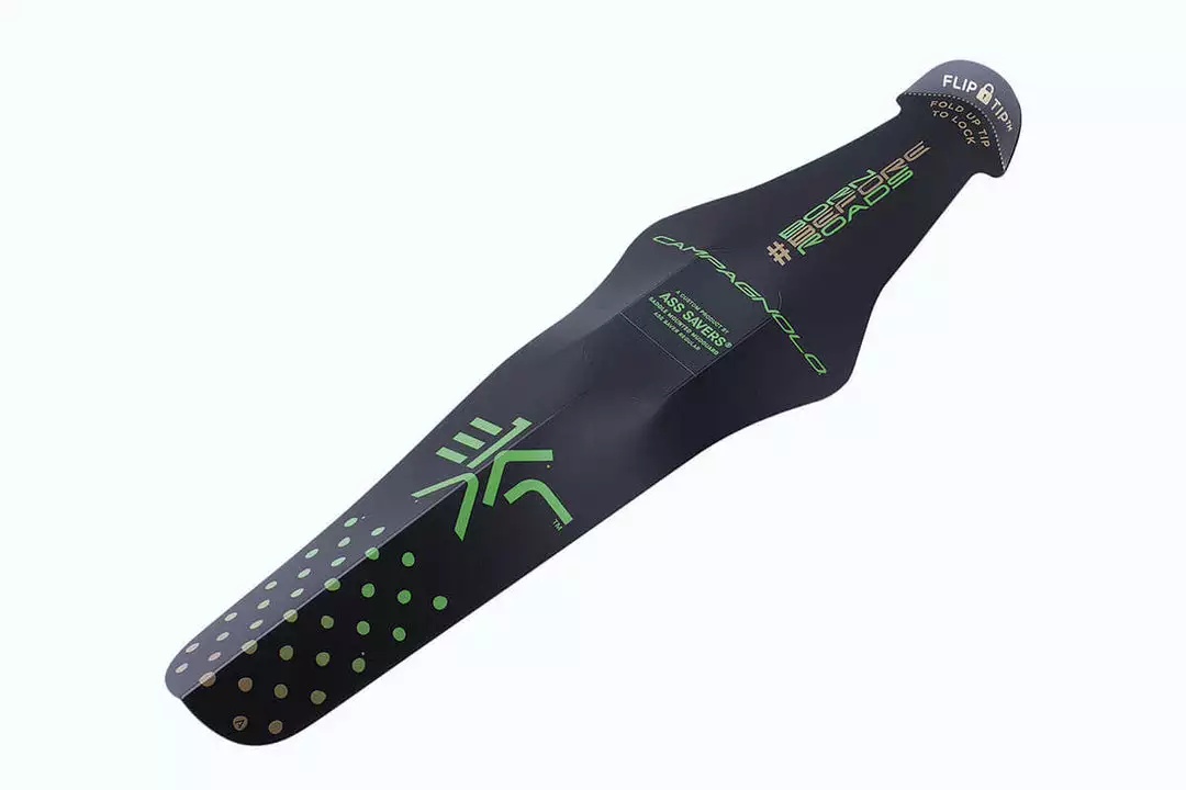 Using the origami principle, patented FLIP-TIP technology allows you to securely fasten the mudguard to the saddle with a simple flip of the tip, just like a cycling cap. To unlock, just flip the tip down and pull towards the back wheel. FLIP-TIP technology is completely compatible with all types of saddle rails including those in carbon.