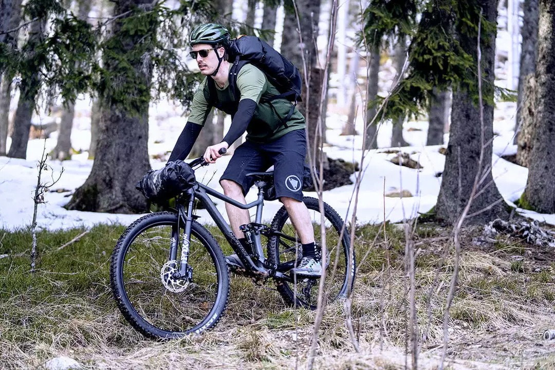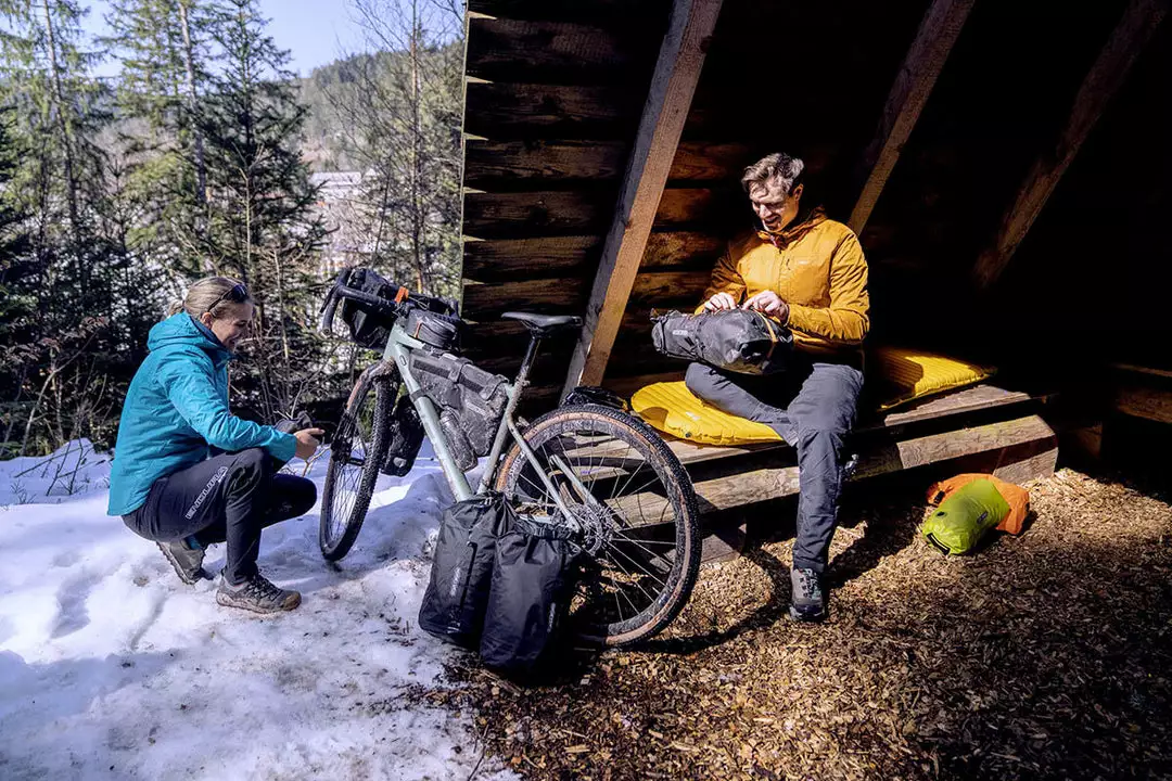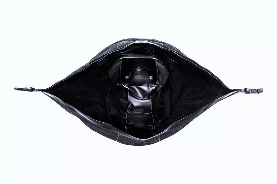 The bag’s reinforcement, four compression straps and compression valve ensure that your gear stays in place, and the entire bag remains stable without any swinging movement. Even bumpy and demanding trails are easy to ride without distraction. A protective plate on the underside of the saddlebag prevents damage in case of tire contact, and the quick bag attachment and removal are a real asset as well. The bag can be removed from the bike in mere seconds using the levers on the fastening sys- tem, and carried into your lodging for the evening with its contents completely dry and dust-free. The roll-top closure promises to keep your belongings dry, even in the foulest weather.