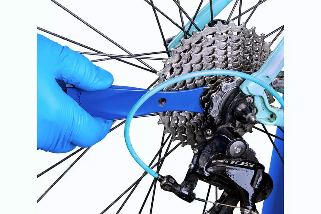 This dual-sided brush is specifically designed for cleaning hard-to-reach areas of the bicycle drivetrain.