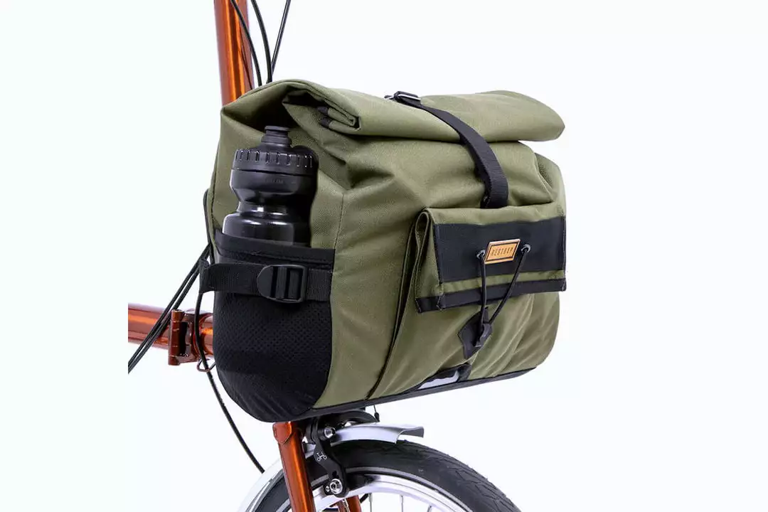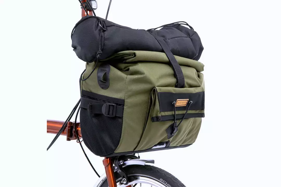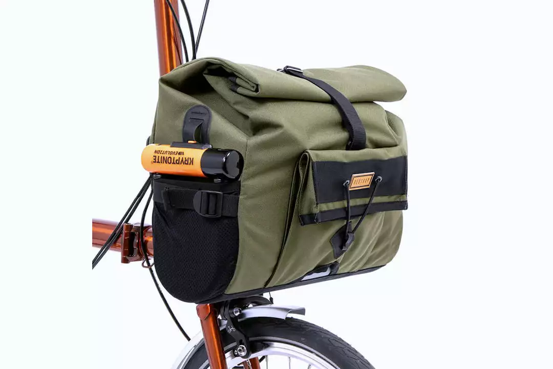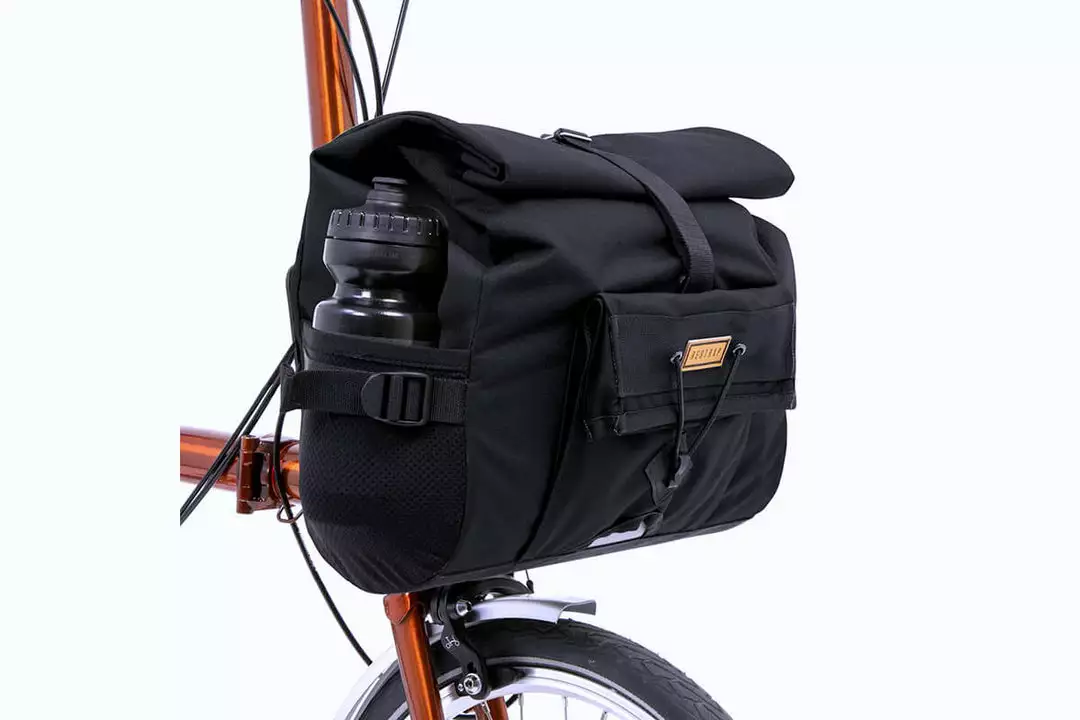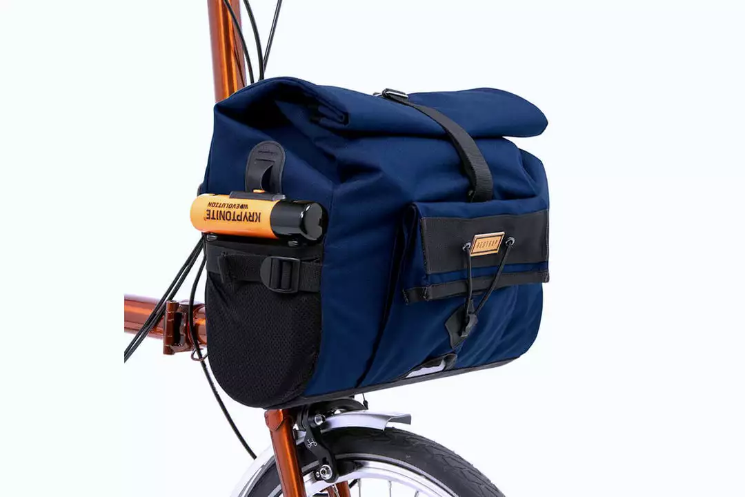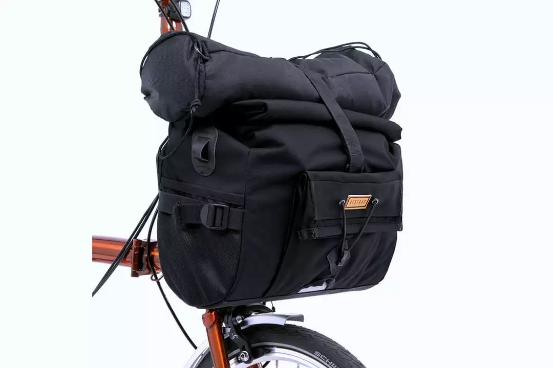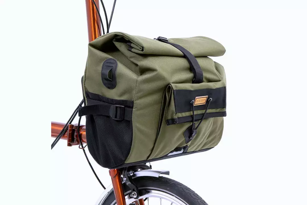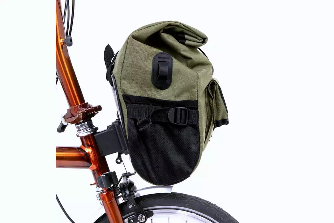 The bag is mounted via a Brompton front carrier block compatible fitting, both external and internal stiffeners enable the bag to hold its shape even when fully loaded. Made of 100% waterproof textured nylon with a tape sealed lining, spare clothes and tech are guaranteed to stay dry on the wettest of rides.