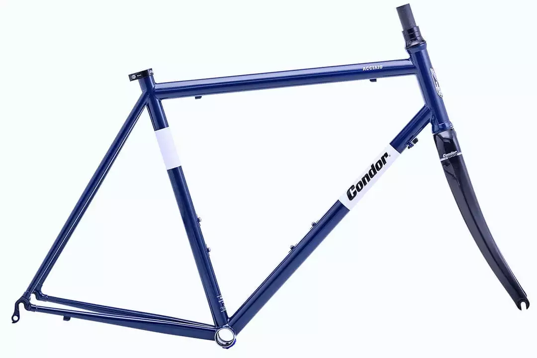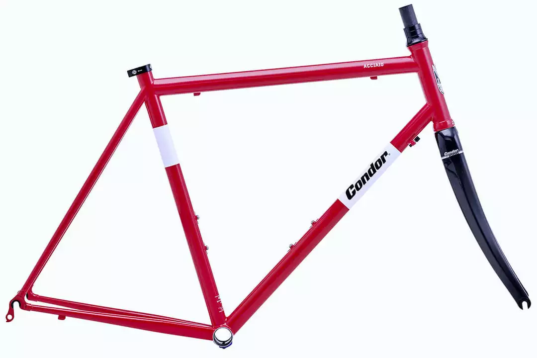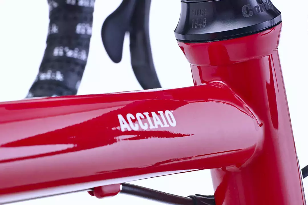 The Acciaio is built for long sojourns in the saddle and grand col mountain climbing. It has a longer wheelbase and slightly taller head tube than our frames with race geometry to reduce rider fatigue on gruelling big ride days. The Acciaio is a lightweight and responsive frameset. The presence of carbon, magnesium, molybdenum and vanadium in the steel tubing creates stiffness, allowing you to push the limits of your fitness. A taller head tube blended with race geometry puts this frame at home on any race circuit or gruelling sportive.