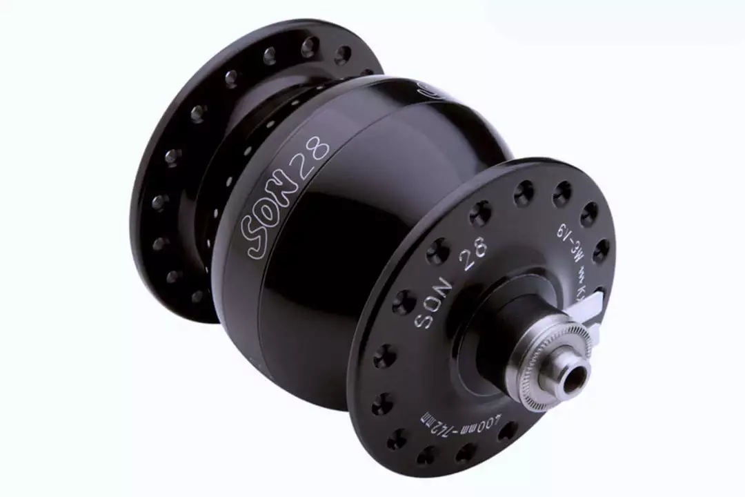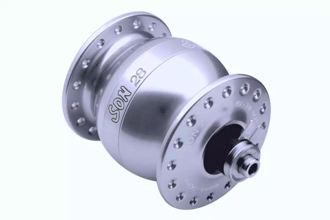 SON 28 is a hub dynamo universally approved for all wheel sizes from 16″ to 29″. The rated output is achieved in the 700c (622)-wheel at approx. 16 km/h (SONdelux at 19 km/h). Thus, SON 28 is recommended if a lot of light is required at low speed or when either devices are to be operated or their batteries charged.
