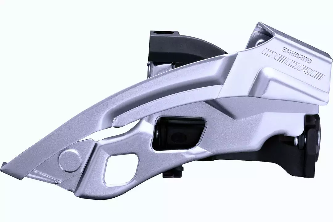 The SHIMANO DEORE M6000 series front derailleurs feature a SIDE SWING design that improves cable routing while also providing a light action and smooth operation on 3×10 speed drivetrains.
