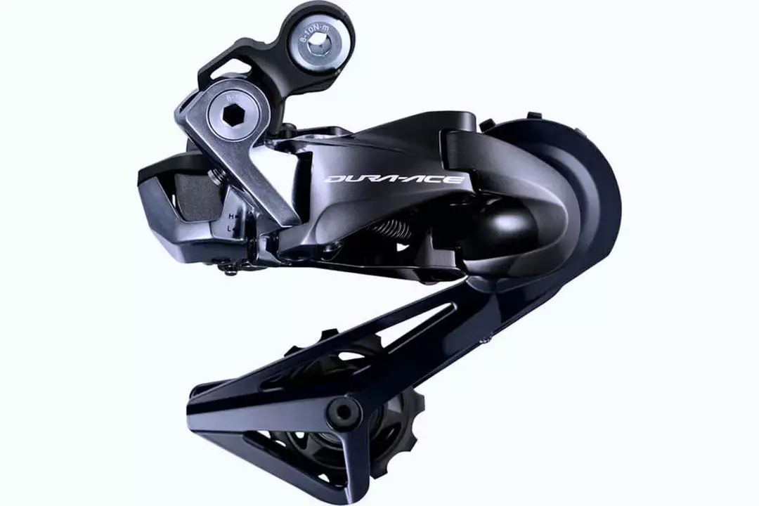 The Dura Ace 9150 Di2 rear derailleur from shimano. The Dura Ace 9150 features sychronised shift that select the most appopriate gear ratio whilst the electronic cables elimianate poor shifting caused by cable stretch and dirt. The Derailluer contains a saver function in the case of a heavy impact will protect the internal.The Dura Ace 9150 Di2 rear derailleur has a carbon cage and pulley plates to reduce weight plus improving stiffness, with self-lubricating pivot bushings. The front derailleur has been redesigned to eliminate outer trim and is more resistant to chain wear due to the forged alloy chain cage.