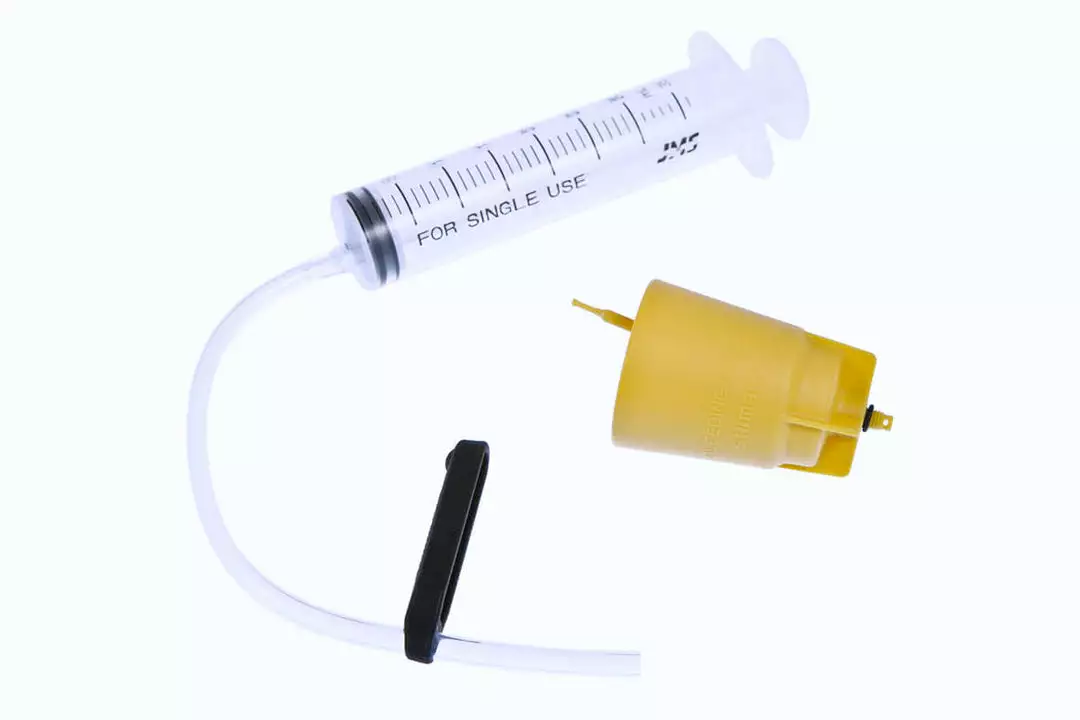 The kit includes an easy to use syringe and hose to draw the fluid through the caliper, a funnel to accurately fill the lever reservoir and a caliper attachment to keep the hose and syringe in place.