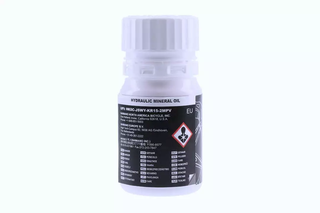 100 ml container of Shimano hydraulic mineral oil for the proper maintenance of Shimano hydraulic disc brakes.