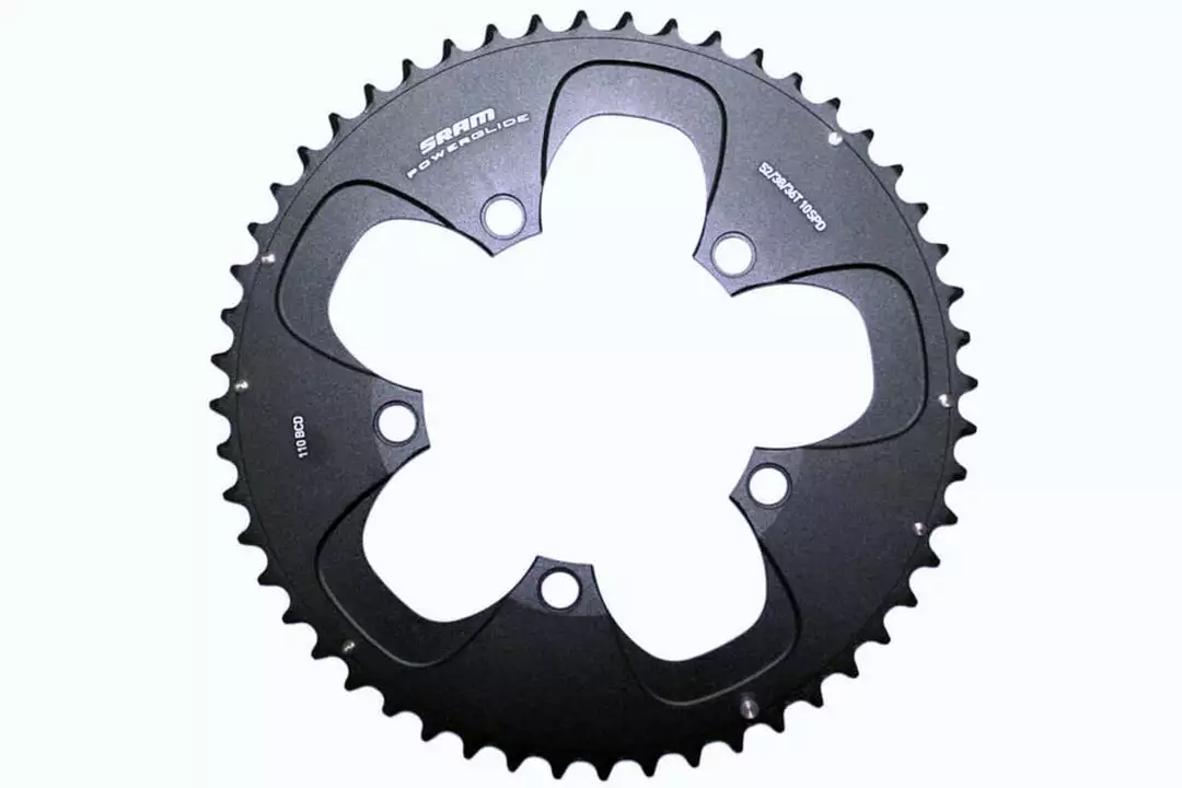 SRAM Road 52 teeth 4 mm chainrings are stamped from 7075-T6 aluminium with black hard anodized finish. PowerGlide ramps/pins for optimized shifting performance. Number of bolts: 5. 110 mm bolt circle diameter.