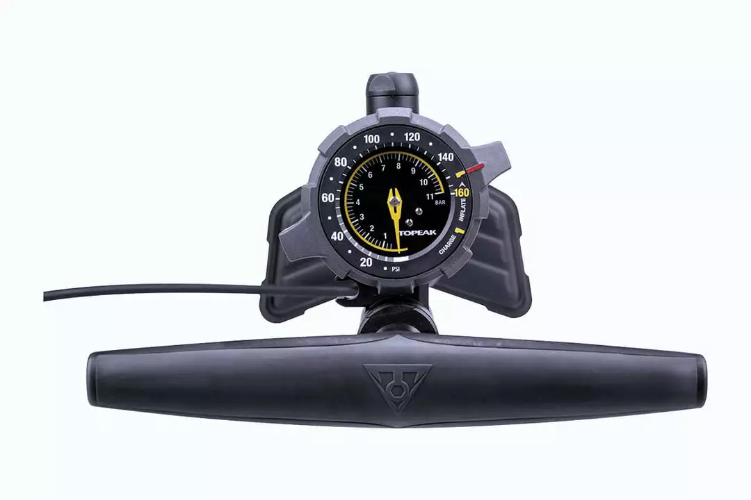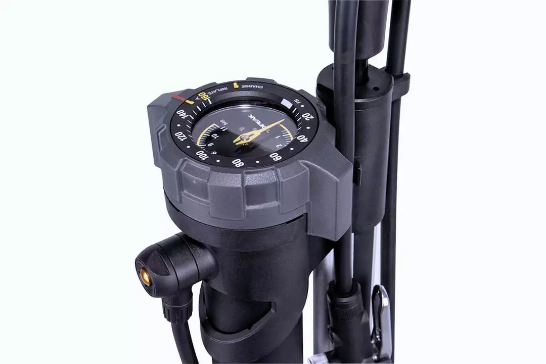 Once you flip the selector from “CHARGE” to “INFLATE” mode, air bypasses the chamber and flows directly into your tyre like a standard pump. The top-mounted easy to read gauge, air release button and comfortable dual density polymer grip, combined with its extra-long hose and stable base makes mounting tubeless and standard tyres a breeze!