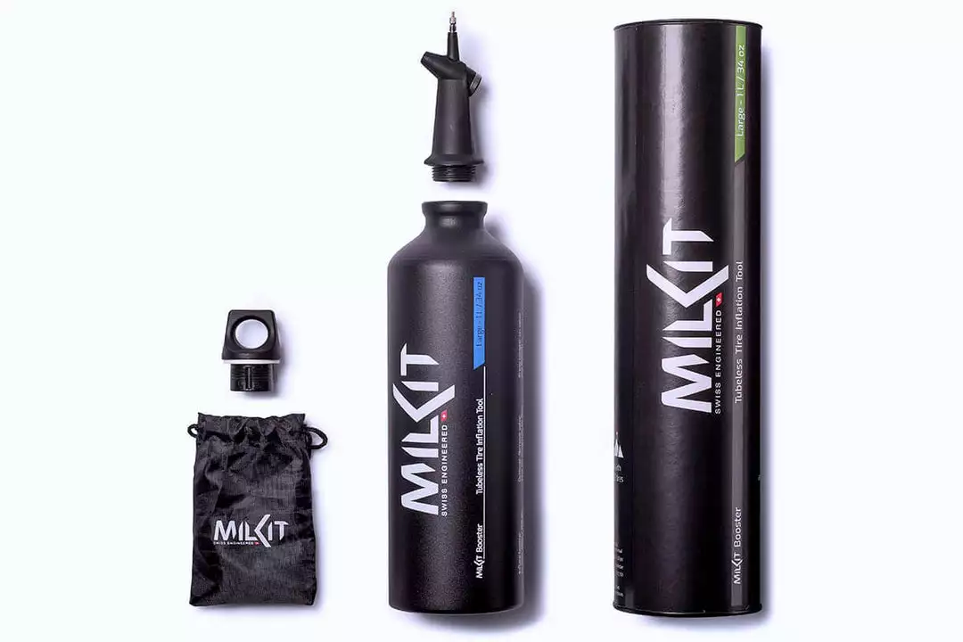 By interfacing with aluminium drinking bottles, the milKit Booster removes the need for a dedicated pressure reservoir, finally making back country tubeless inflation a practical option. Just screw the head onto the bottle, use your hand pump to pressurise it to up to a maximum of 160 PSI and then press the head onto any Presta valve to mount the tyre. Direct connection with no hose between the pressure chamber and valve means the initial rush is delivered instantly, increasing the chances of getting a seal first time.